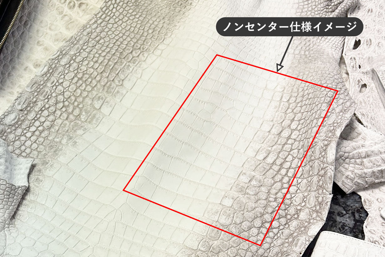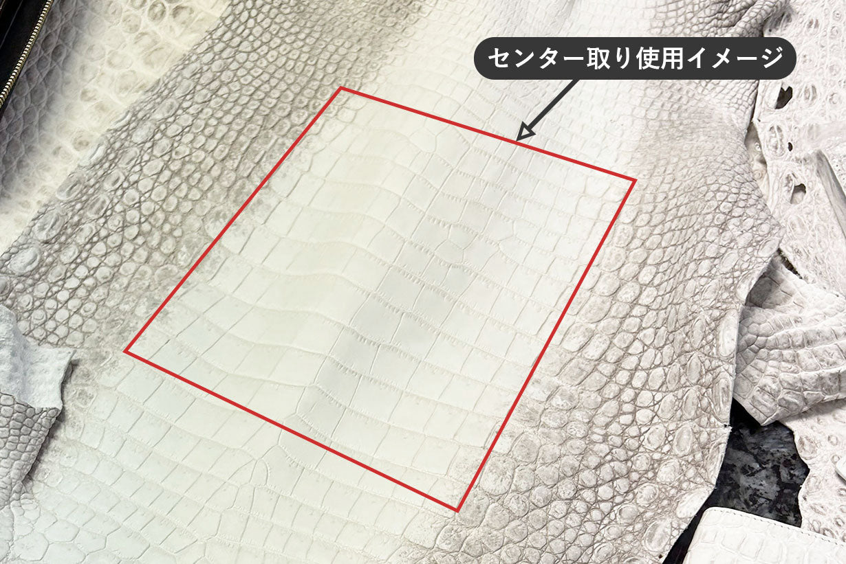 クロコダイルの美しさは、そのウロコ模様に宿ります。特に「センター取り」は、腹部の美しい部分を使い、左右対称のバランスで仕立てられた贅沢な仕様。一方「ノンセンター取り」は、アシンメトリーな美しさと価格のバランスを両立したタイプです。