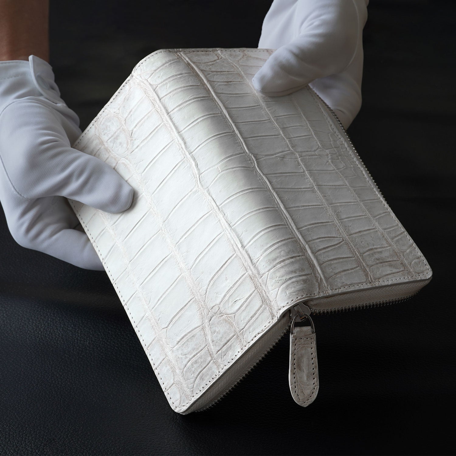 クロコダイル革で贅沢な部分とされているお腹の部分を使い、平らに広げたときに左右対称になるように革を裁断しています。革の模様を贅沢に楽しめる裁断方法です。