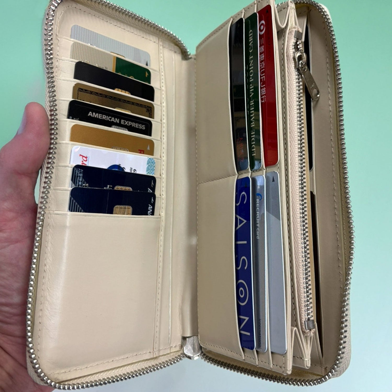 カードは最大21枚収納できます。重なることなく収納できるので、ぱっと開けたときに必要なカードをサッと取り出せます。最初は革が少し固く入れづらく感じられるかもしれませんが、使っていくにつれ馴染んで柔らかくなってきます。
